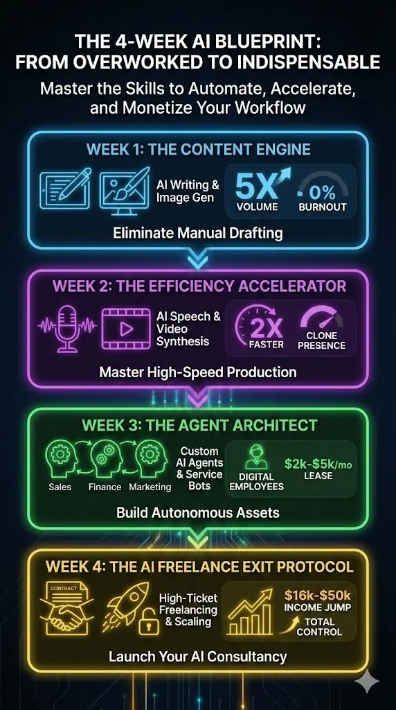- The Skills: The “Unfair Advantage” Freelance Framework: Pricing your AI services, finding “high-intent” clients on LinkedIn/Upwork, and packaging your Week 1-3 skills into productized offers.